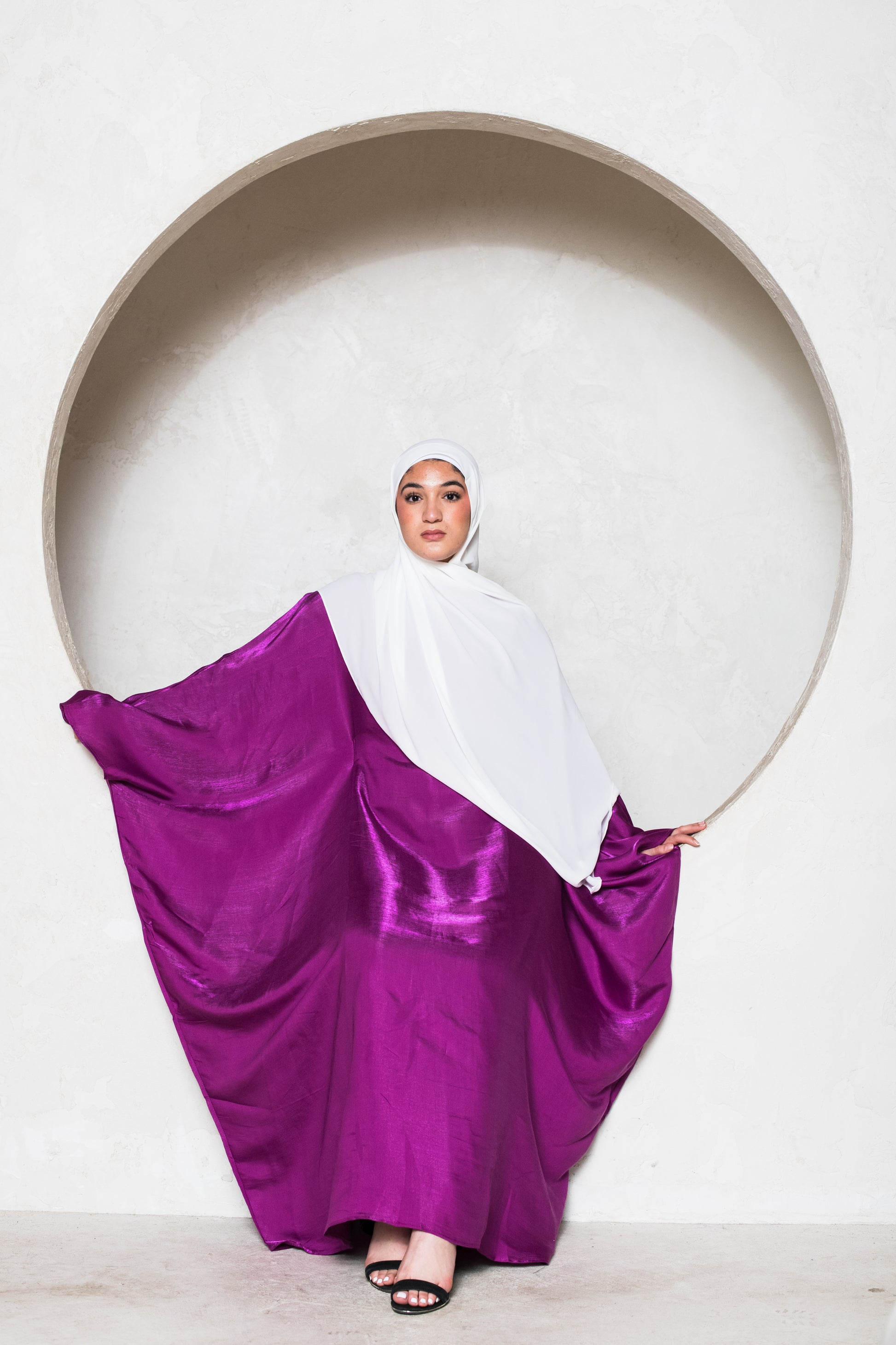 The luxurious fabric shimmers with subtle hues of lavender and gold, adding a sophisticated touch. The design is minimalist yet impactful, with a loose, comfortable fit that offers ease of movement, while the gold accents on the sleeves bring a hint of glamour.